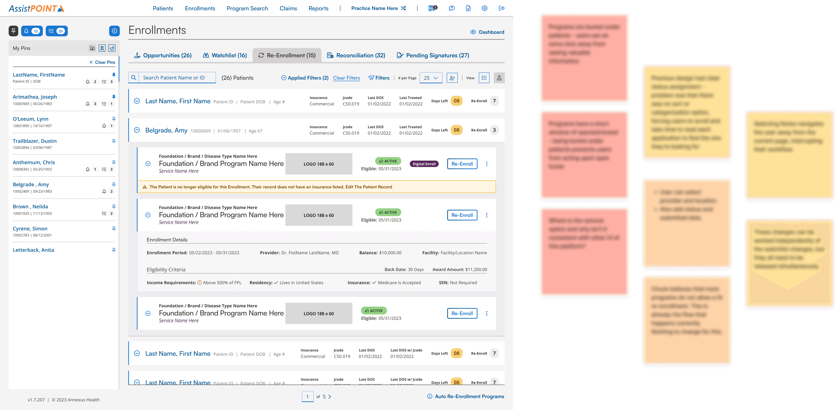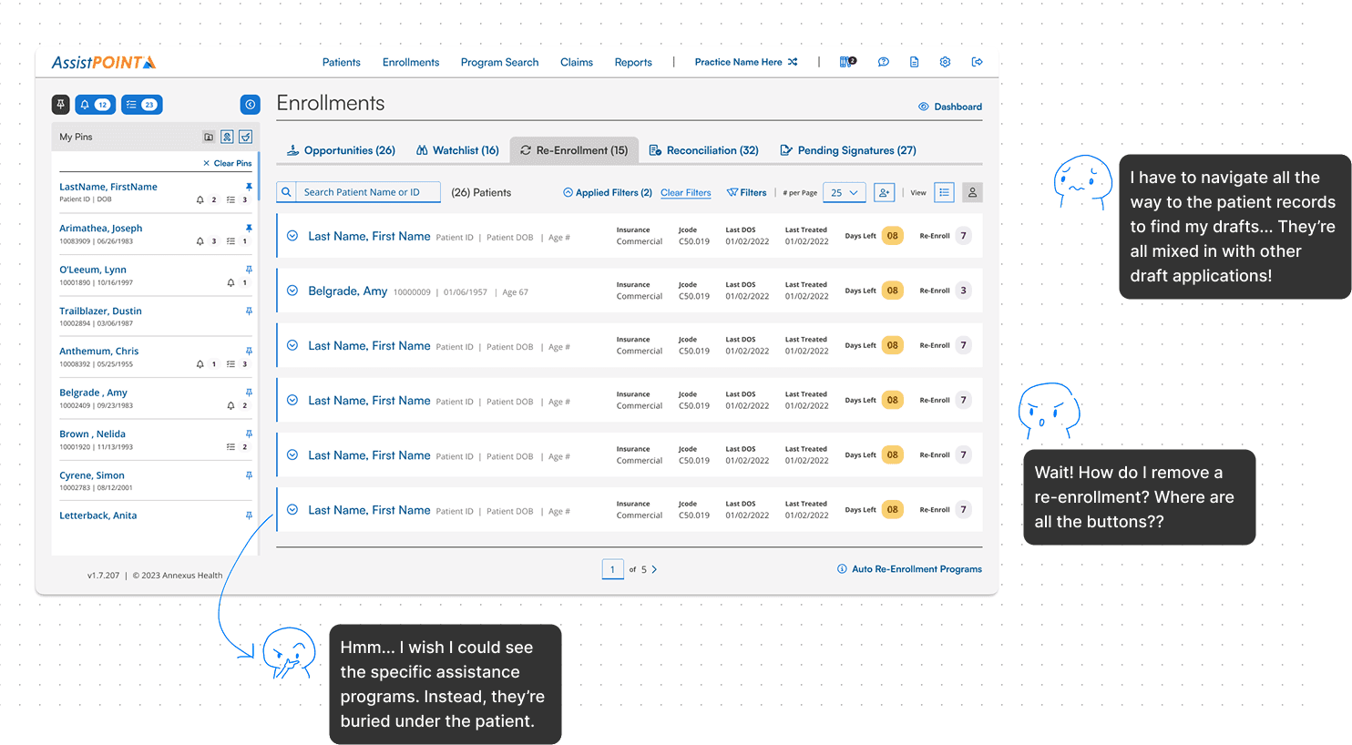 The company’s initial re-enrollment design (meant to enhance the experience) resulted in more user frustrations. I launched an investigation to uncover the true user pain points in order to provide an enhanced UX that reversed previous failures. This ultimately led to an efficient, streamlined patient re-enrollment process.