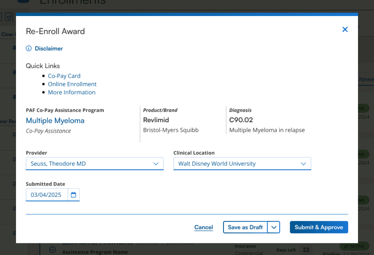 Reduced cognitive load and potential for abandonment by integrating key page resources directly in the re-enrollment workflow, eliminating back and forth navigation