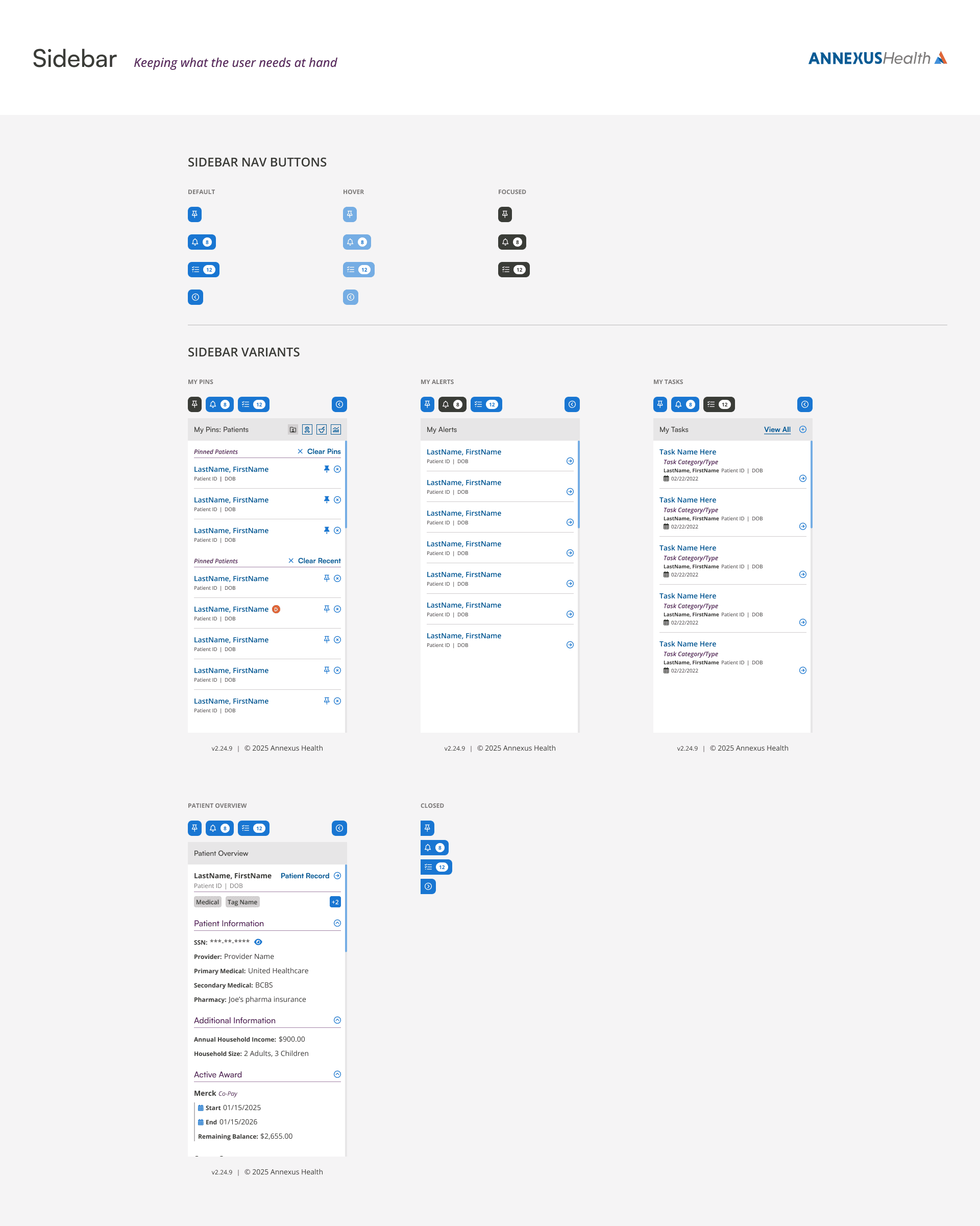 We designed a persistent, dynamic sidebar to act as a mini-digital workspace. By allowing the user to “pin” or “bookmark” patients and reports from a recently viewed history as well as view assigned tasks, alerts, and specific patient overview information, we eliminated the need for physical sticky notes and reduced the context switching friction.